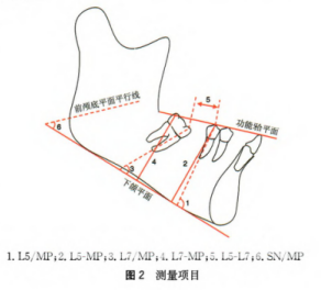 測量項目共計6項,見圖2:L5/MP,下頜第二磨牙與下頜平面的前角交;L5-MP,下頜第二磨牙頰尖點至下頜平面的垂直距離;L7/MP,下頜第二磨牙與下頜平面的前交角;L7-MP;下頜第二磨牙遠中頰尖點至下頜平面的垂直距離;L5-L7,下頜第二前磨牙頰尖點與下頜第二磨牙近中頰尖點在功能牙合平面投影的距離;SN/MP,前顱底平面與下頜平面的夾角。